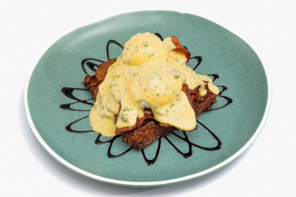 herbed potato waffle, wood smoked bacon, poached eggs, fresh jalapeno hollandaise