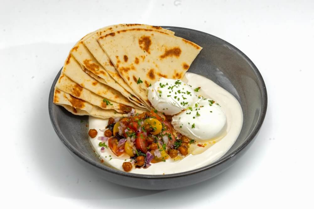 two free range poached eggs, whipped feta, flatbread, chickpeas, fresh tomato, red onion, dill, chili oil