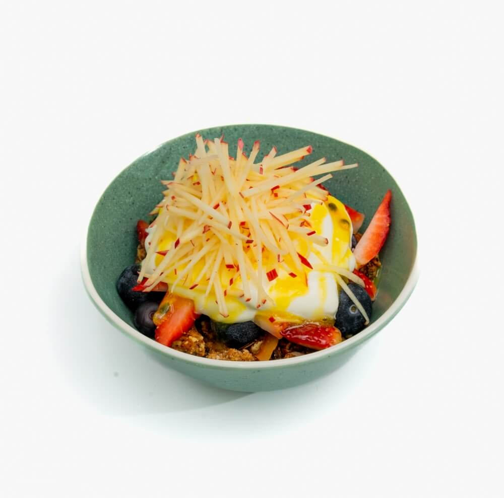 Coconut or greek yoghurt, coulis, seasonal fruit