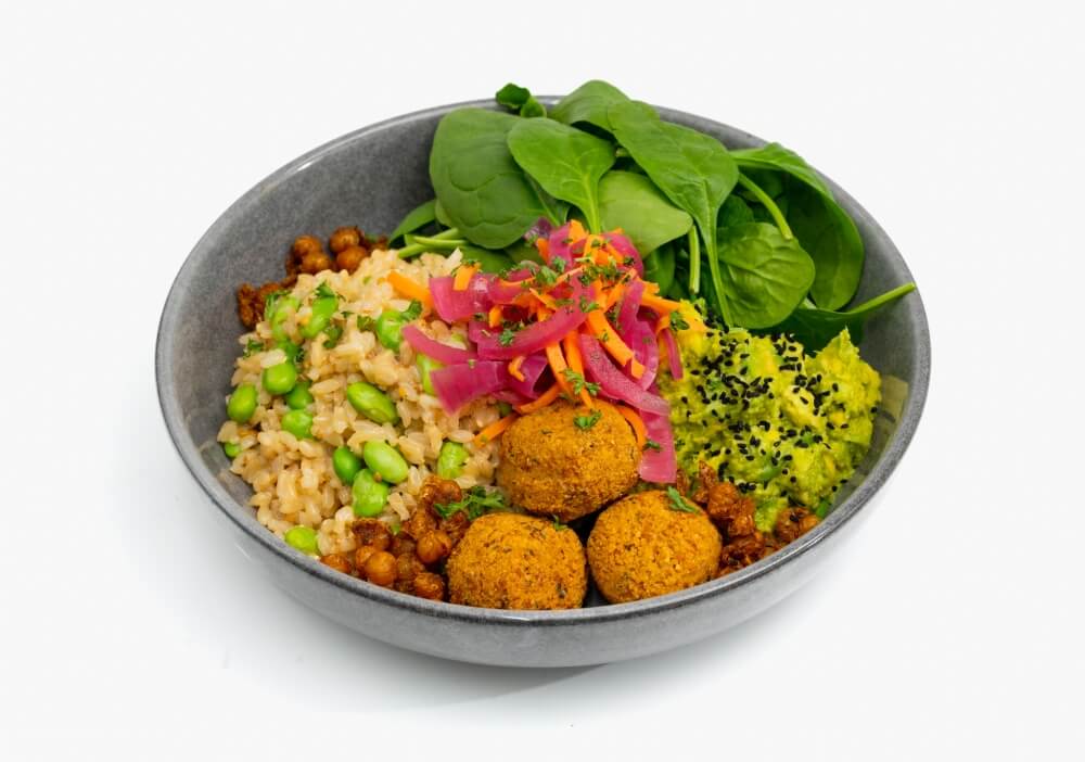 Brown rice, falafel, avo, pickled carrots, edamame beans, & sesame dressing